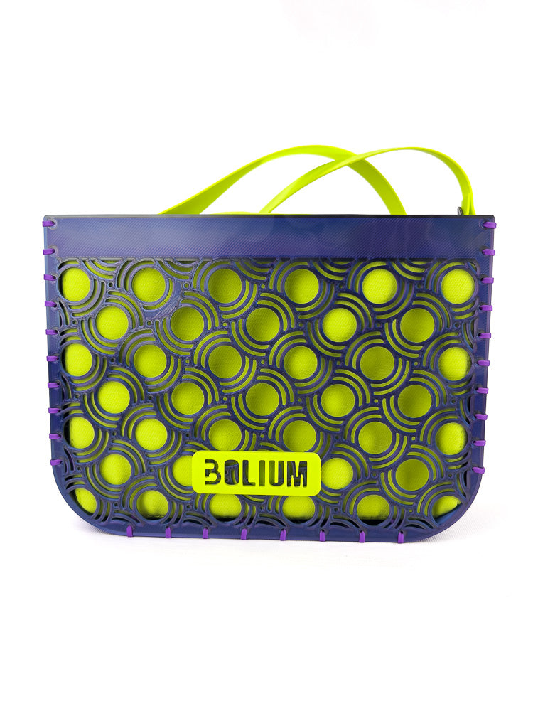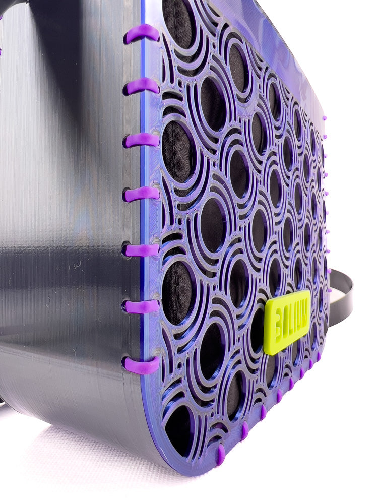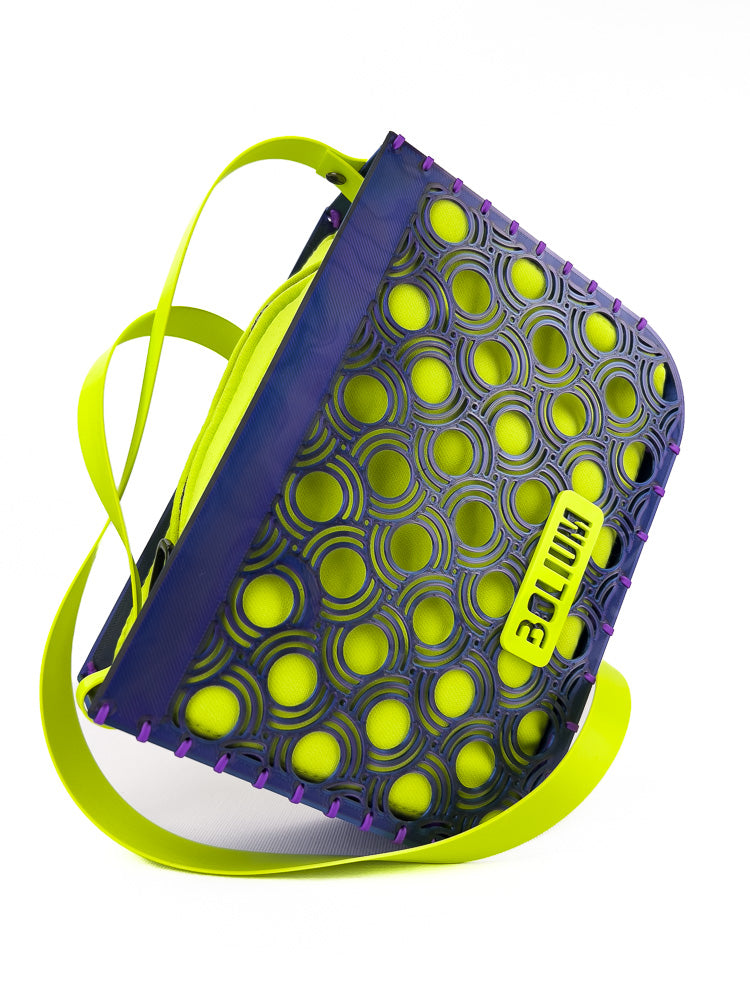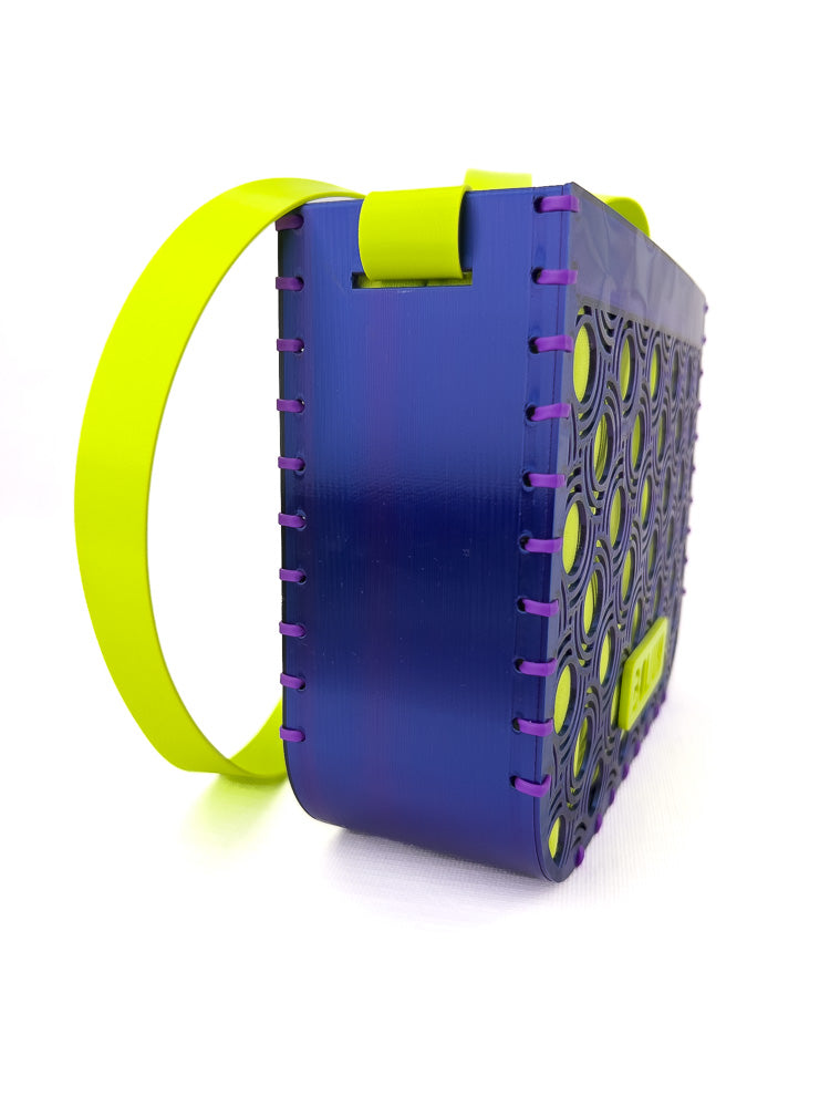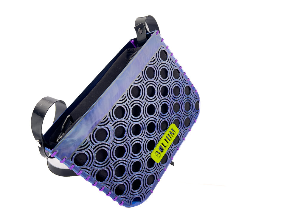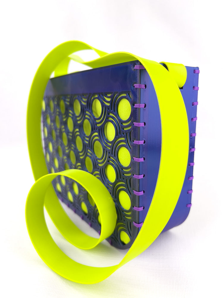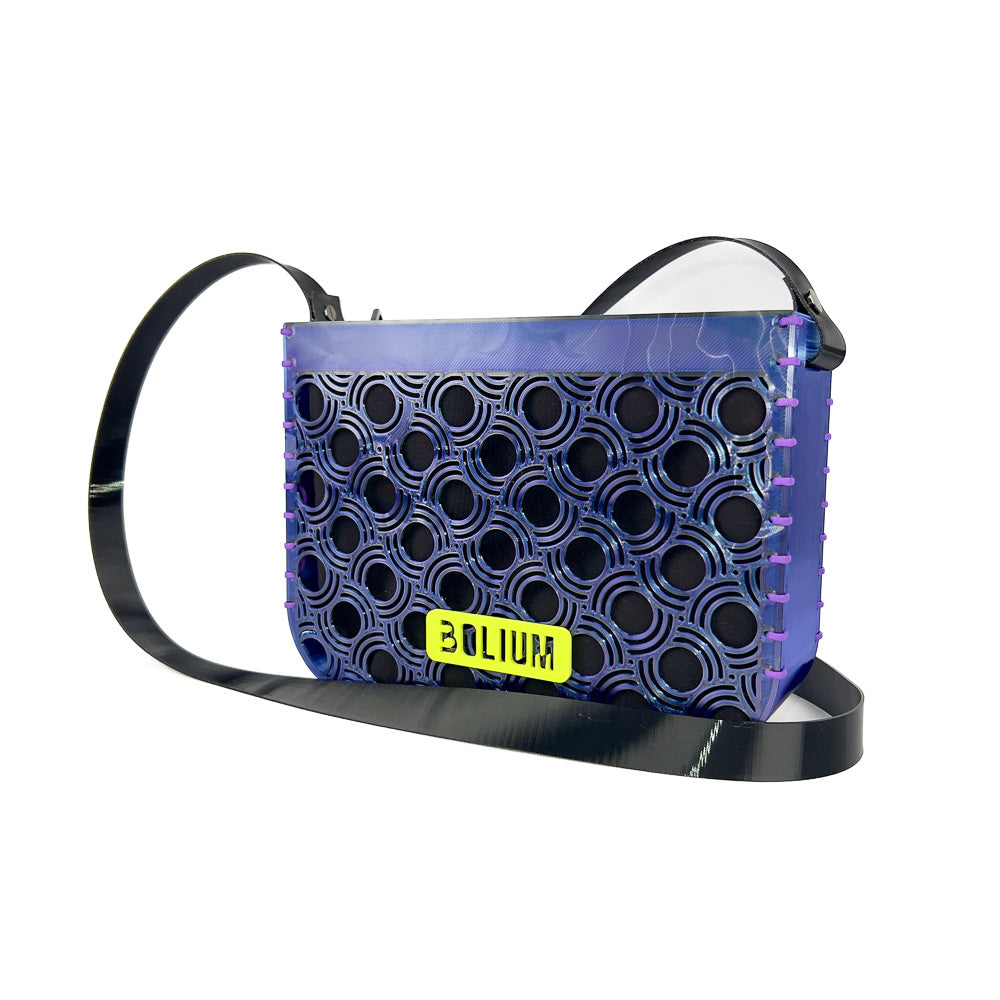 El Bolium Nebula es un bolso vanguardista impreso en 3D que fusiona innovación y sostenibilidad. Su estructura geométrica en relieve combina un acabado morado profundo con detalles en amarillo flúor para un contraste moderno y atrevido.